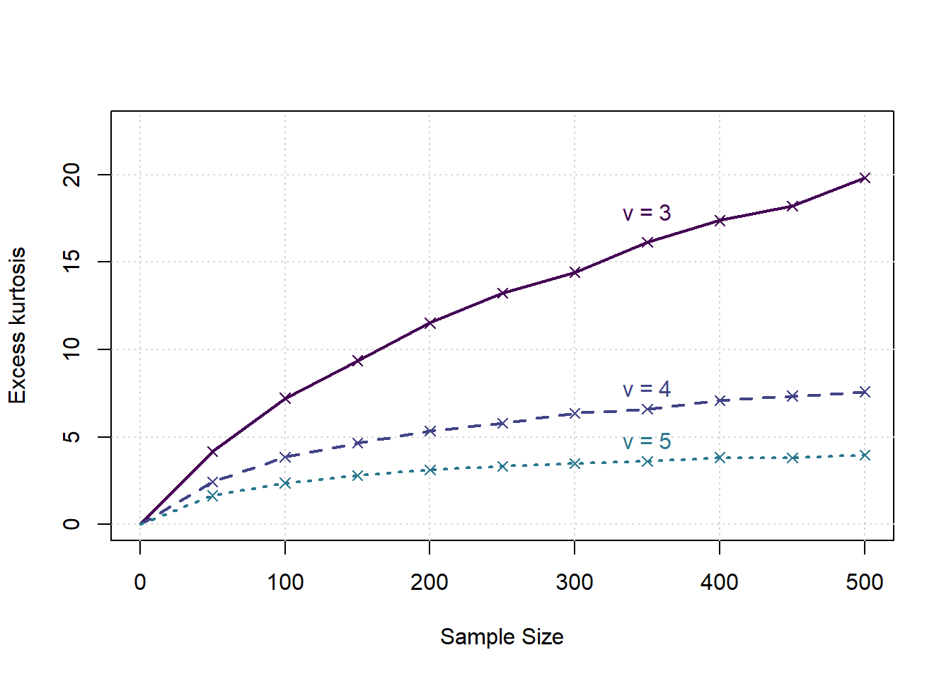 plot(c(0,max(samplesizes)),c(0,max(samplesizes)/22),type='n',xlab = 'Sample Size', ylab = 'Excess kurtosis', main='')